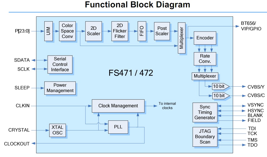 FS471 features: (1)Designed for battery operated handheld devices; (2)Advanced power management enables sleep mode current of 20μA; (3)Load sensing video outputs; (4)Two 10 bit DACs supporting S-Video or CVBS video output ; (5)Multiple output analog formats: NTSC, NTSC-EIAJ, PAL(B/G/H/I/M/N/60); (6)Closed Captioning, CGMS-A, and WSS supported; (7)ITU-R BT.656/601 video input modes supported; (8)Programmable input interface (24 / 18 / 16 / 15 / 12 and 8 bit); (9)Supports various RGB and YCrCb input formats, and resolutions from 220x176 to 1366x768; (10)Adjustable brightness, contrast and saturation; (12)Advanced 2D up / down scaler.